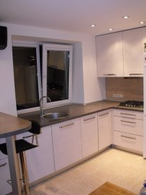 Virtuvės baldai gaminami iš itin kokybiškų medžiagų, fasaduose naudojama tik kokybiška ir ilgaamžė egger, keindl (Austriška) plokštė, stalviršiai taip pat austriški. Visa virtuvės furnitūra Blum (Austrija, 20metų garantija suteikiama šiai furnitūrai), stalčių bėgeliai su pristabdymu, lankstai su blumotion sistema, švelnus prisidarymas. Virįtuvė su kampu - 2,5m x 1,4m. Viršutinės spintelės iki lubų. Apatinių spintelių aukštis standartinis 86cm. Su baru.